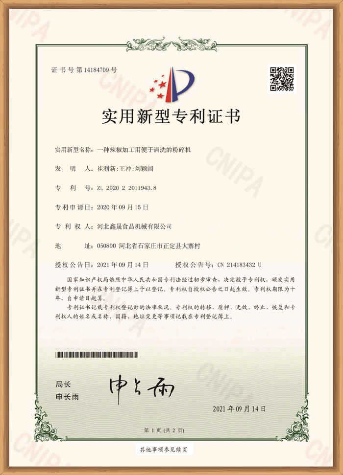 一种辣椒加工用便于清洗的粉碎机专利证书