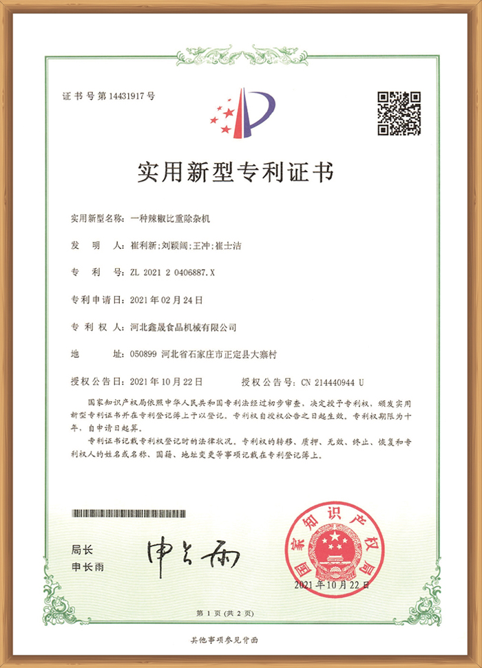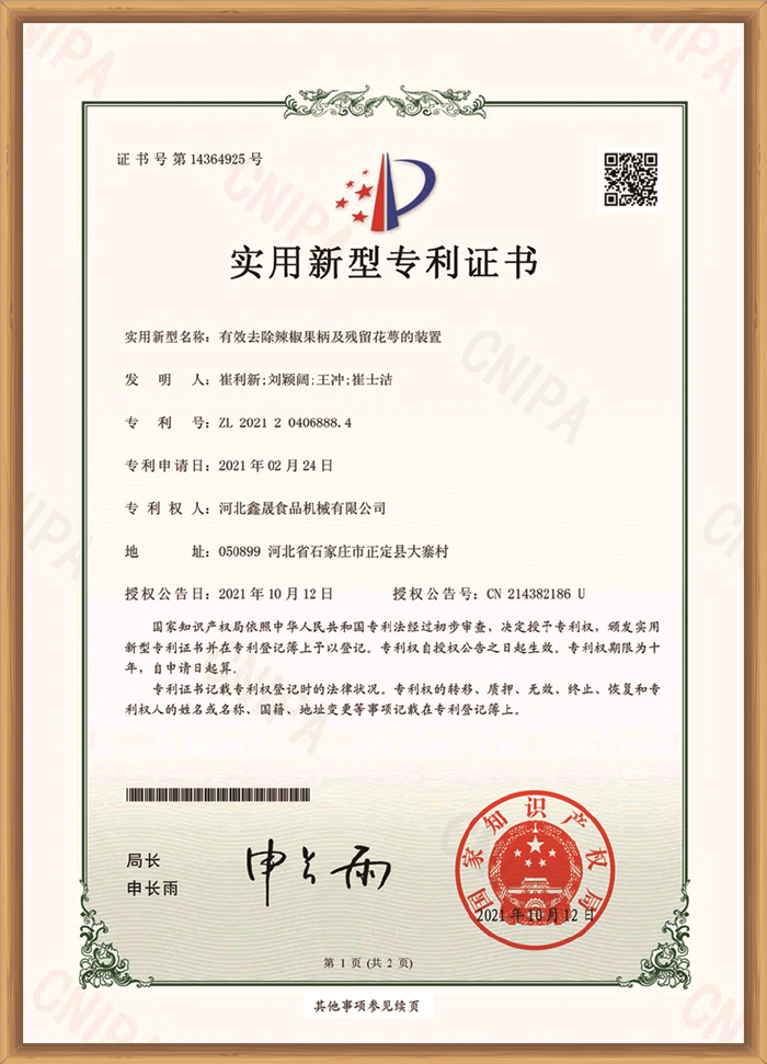 有效去除辣椒果柄及残留花萼的装置专利证书