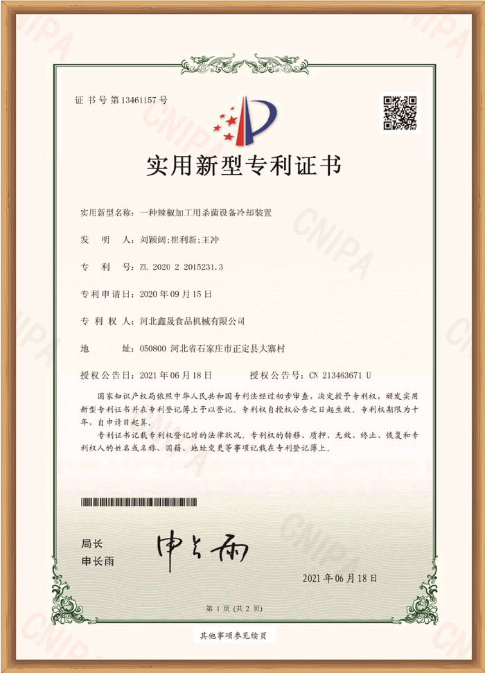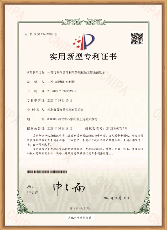 一种可蒸气循环利用的辣椒加工用设备专利证书